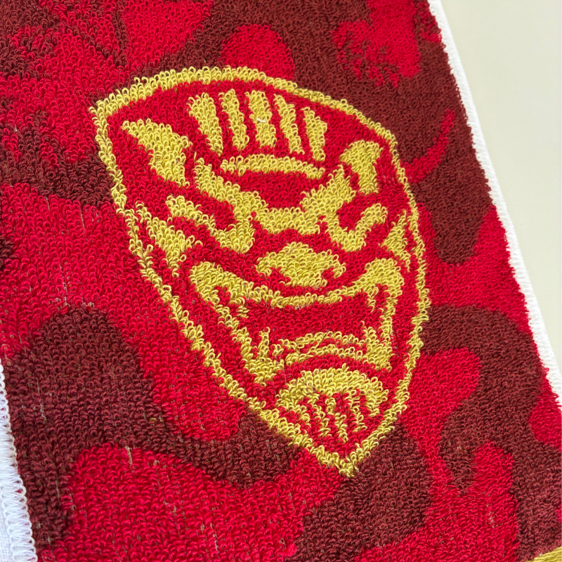 エンブレムデザインを主としたベンガラカラーのタオルです